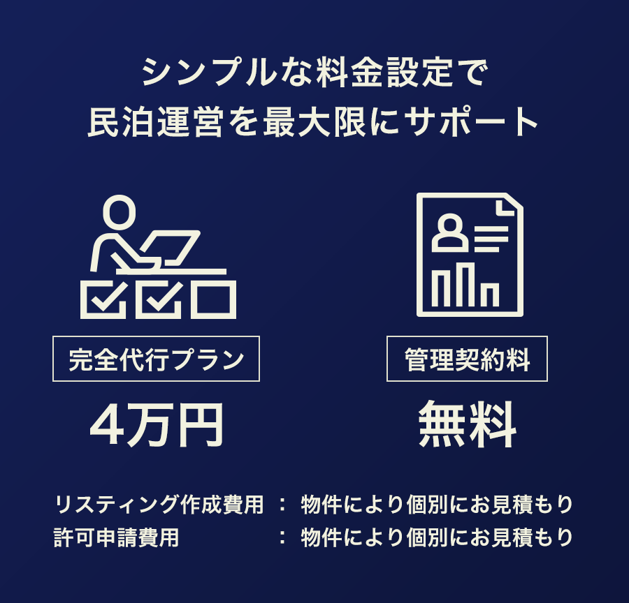 OTAサイトのSEO対策、宿泊料金の最適化、アカウントのスーパーホスト化、消防法や物件の許可の申請など法律からITまであらゆる提案と対応を行います。